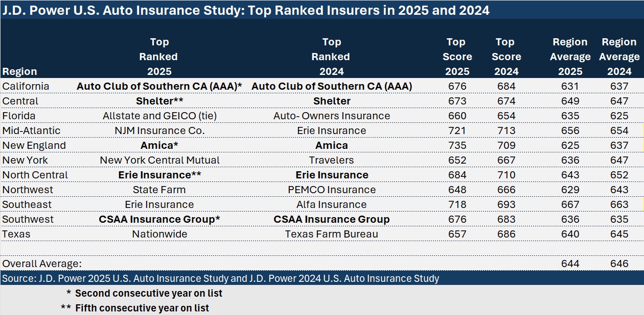 Like previous years, the latest study provides rankings of insurance companies according to their satisfaction scores across 11 regions. Below, Carrier Management has compiled a summary of the top-performing insurers for 2025 and 2024, along with their scores compared to the regional averages where they secured first place.
