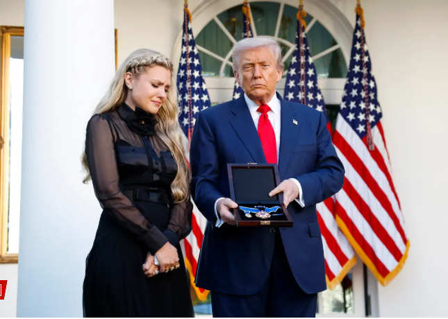At a White House ceremony on October 14, 2025, President Trump posthumously presented Charlie Kirk with the Presidential Medal of Freedom, with the Turning Point USA founder’s wife, Erika, by his side. Photo by Kevin Dietsch/Getty Images