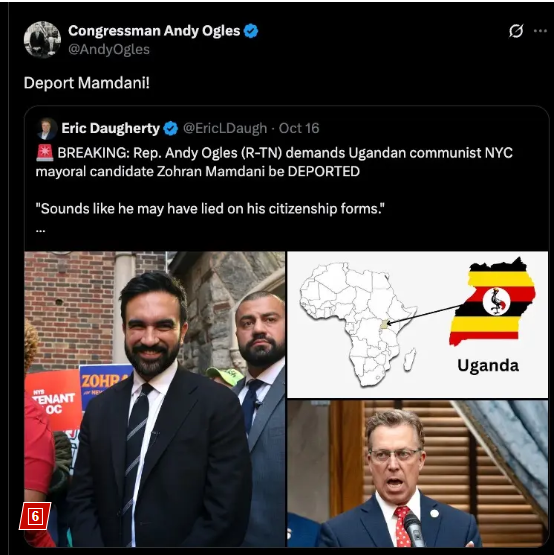 Ogles issued a call to “Deport Mamdani!” and branded him an “antisemitic, socialist, communist who will destroy the great City of New York.”