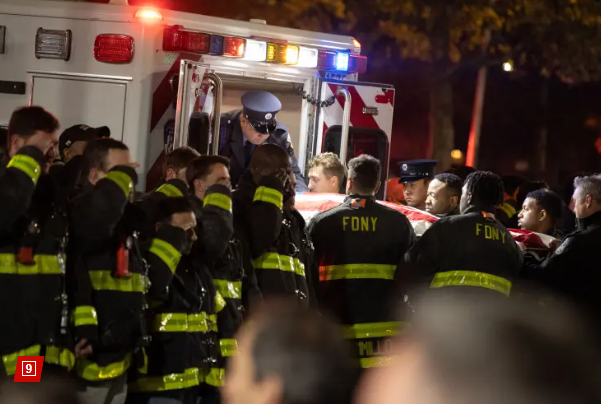 The flag-draped body of firefighter Patrick Brady, who lost his life battling a blaze, is loaded into an ambulance outside Brookdale Hospital in Brooklyn on Nov. 9, 2025. Robert Mecea