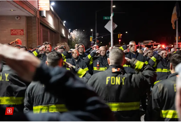 In a solemn tribute, dozens of mourning firefighters, joined by Mayor Adams and other first responders, stood at attention and saluted Brady as the ambulance slowly pulled away from the hospital.