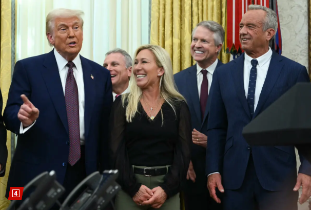 President Donald Trump stood with Rep. Marjorie Taylor Greene at Robert F. Kennedy Jr.’s swearing-in ceremony in the Oval Office on Feb. 13, 2025, in a display that drew widespread attention. AFP via Getty Images