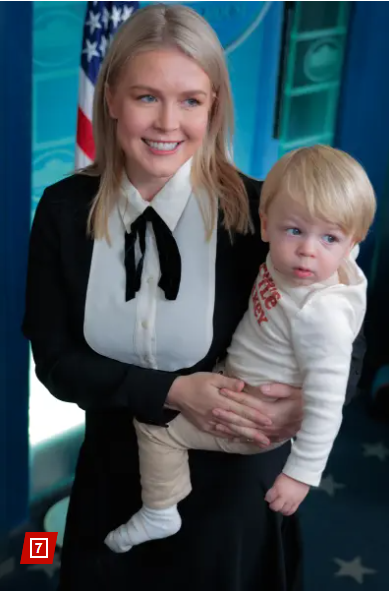Karoline Leavitt with her son Niko in the White House press briefing room on November 25, 2025, a rare personal moment amid the intensity of her high-profile role. Getty Images