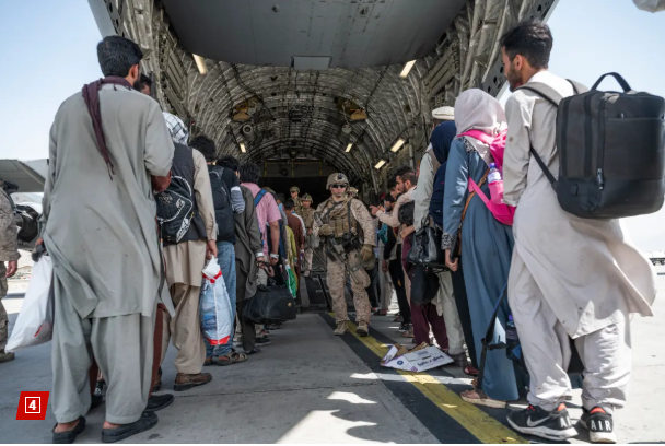 U.S. Airmen and Marines escort eligible evacuees aboard a U.S. Air Force C-17 Globemaster III during the Afghanistan evacuation at Hamid Karzai International Airport (HKIA) on August 21, 2021. U.S. Central Command Public Affairs